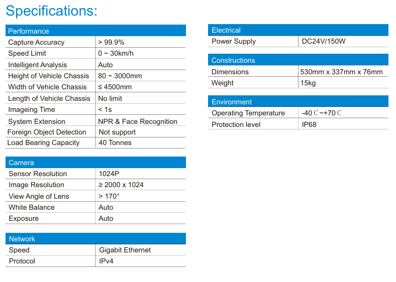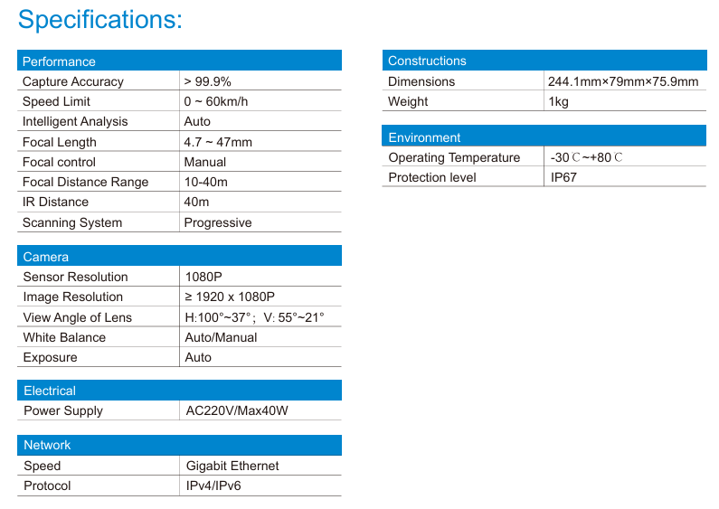 Featuring a True Day/Night, 2-megapixel resolution LPR camera in parking and access control environement, video detect and recognize the plate in low speed less than 40km/h with embedded LPR algorithm.