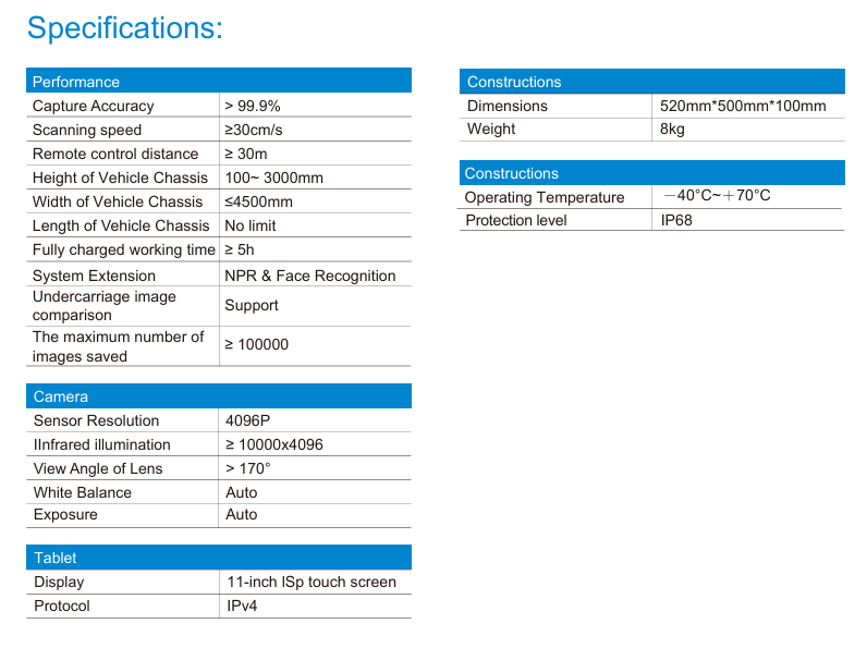 Comparing with the outdated ordinary line scan camera in the traditional system, the system adopts new generation intelligent area scan camera technology. Support vehicle changing speed while scanning Built in ISP SPEED DETECTOR (ISD), there for no strict requirement for the speed of the vehicle.The image quality will not be affected no matter vehicle changing speed, or even stop and move. Vehicle speed up to 60 km/h Based on ultra high frame rate sensor, together with specially designed ASIC like processor, area scan technology makes it possible for UVSS to capture high speed vehicle up to 60 km/h. 4096p image resolution High resolution color image allows zoom in to all details in concern.